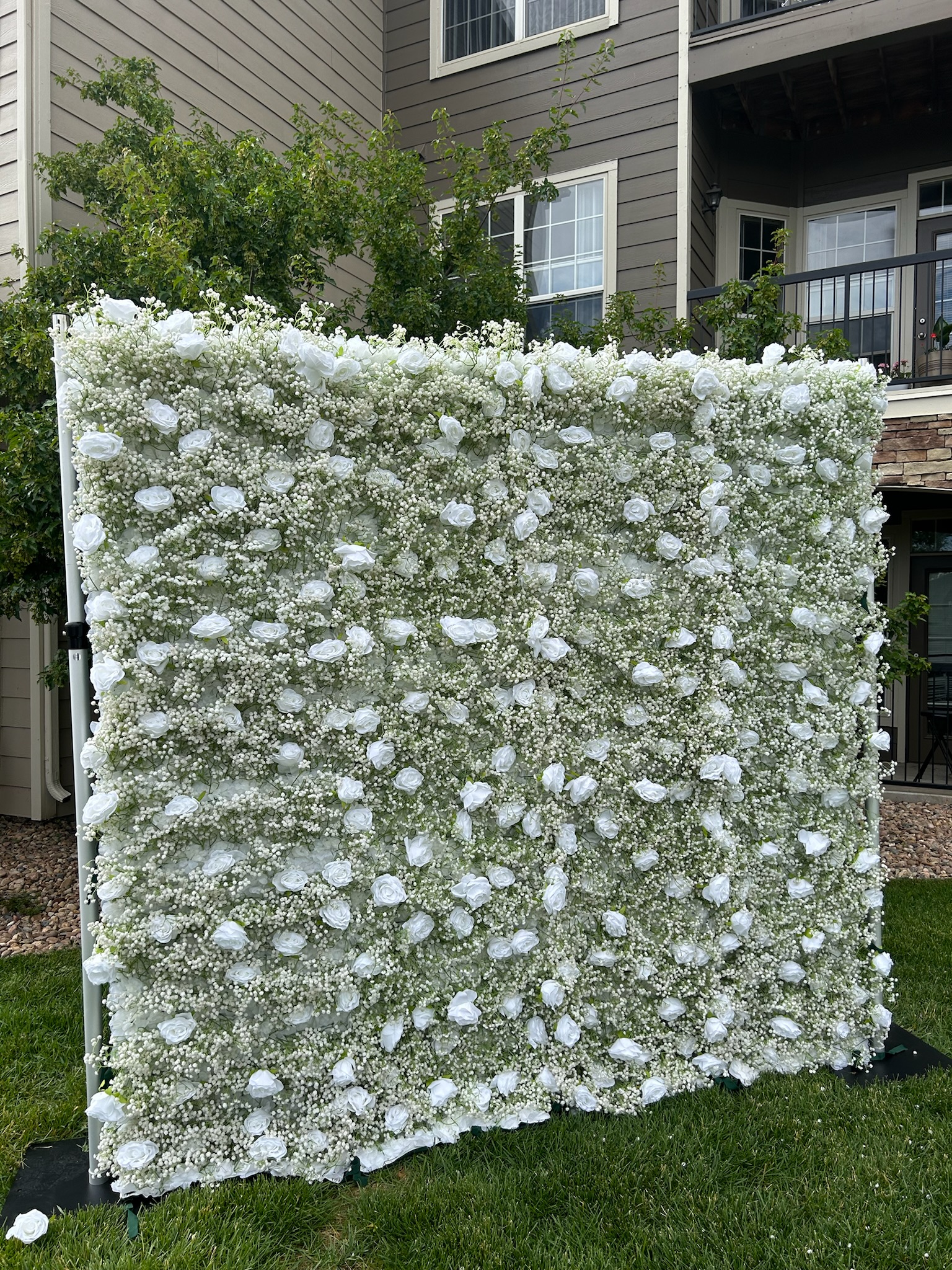 Experience Soft Romance with Our White Rose & Baby’s Breath Wall